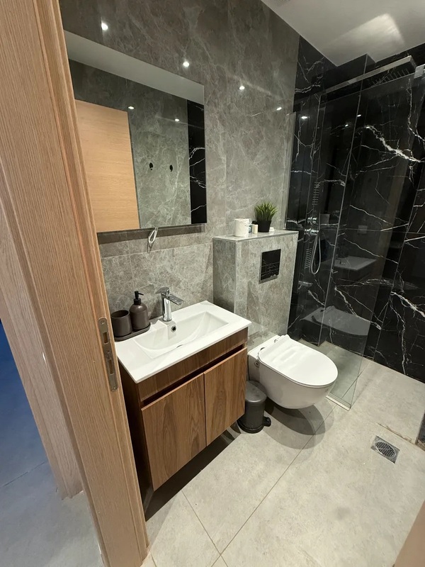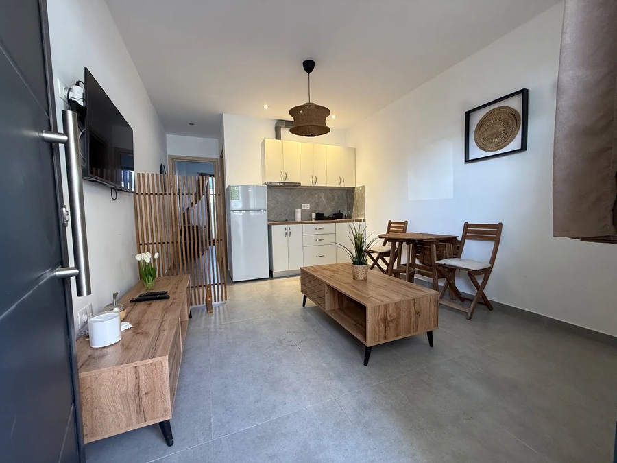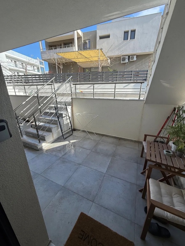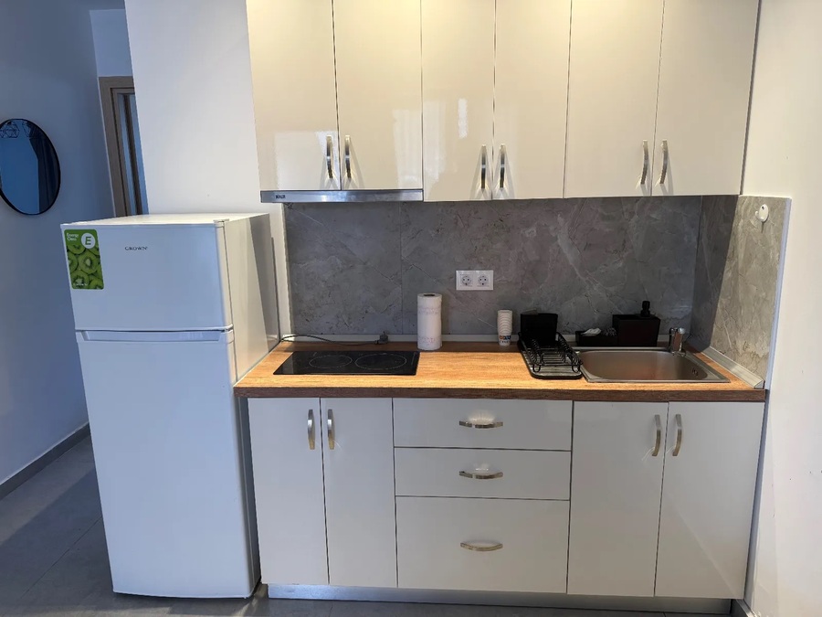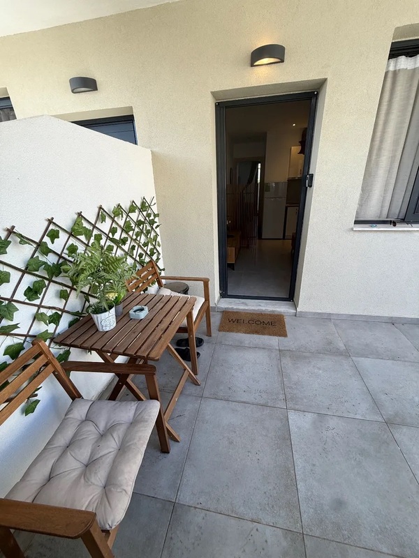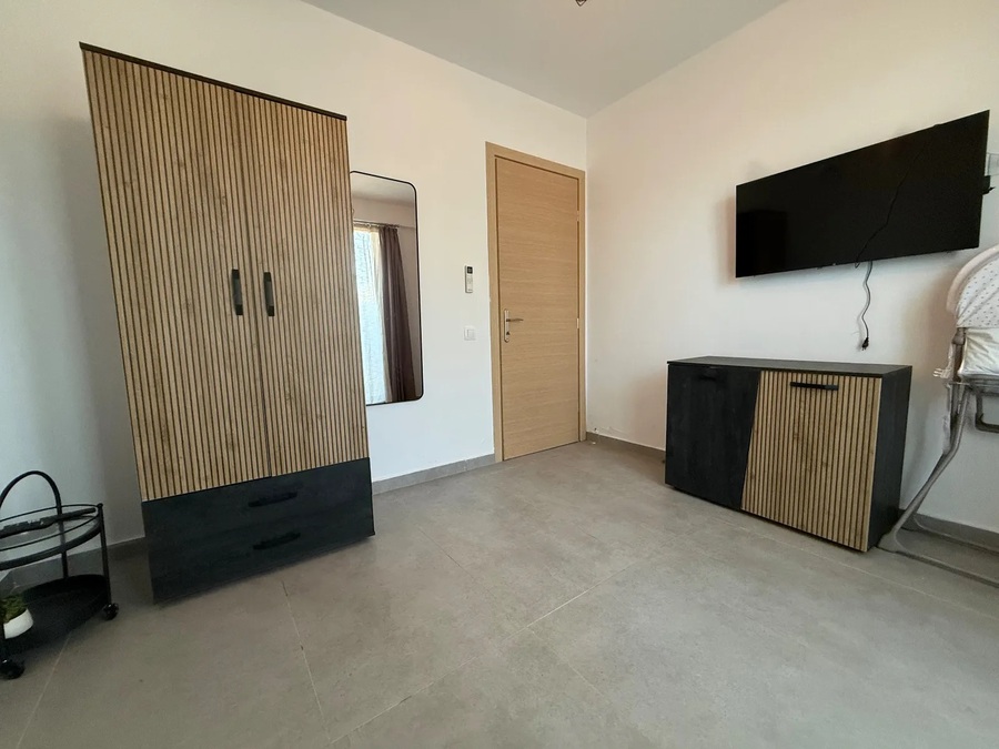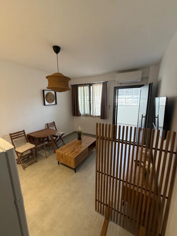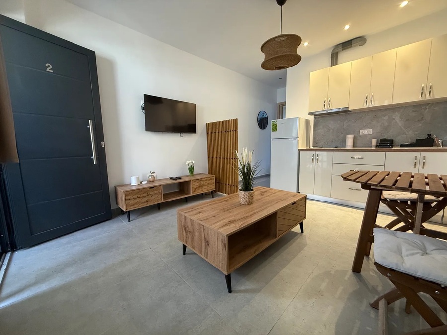 This apartment for sale in Kallithea Halkidiki is in like-new condition and located on the lower ground floor of a recently constructed building. It features 1 double bedroom, a walk-in shower room, and a bright living room with an open kitchen, fully furnished and equipped.