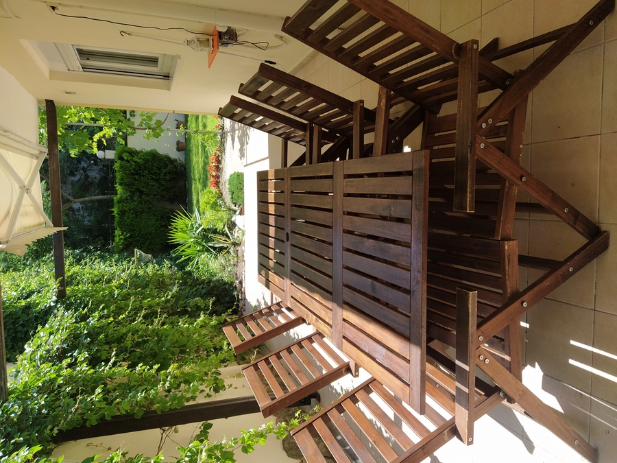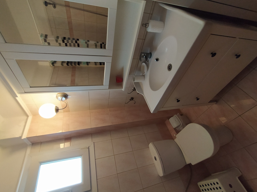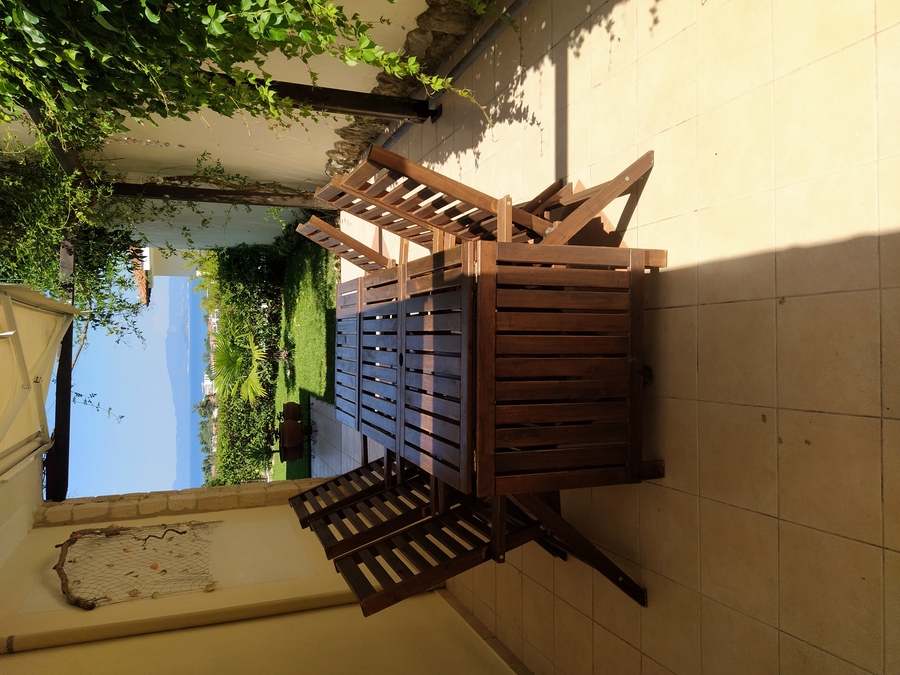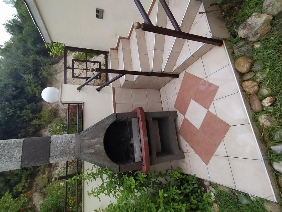 The property has four bedrooms in total, with three on the upper floor, each equipped with air-conditioning and enjoying a private balcony. A family bathroom with bathtub serves the upper floor, while there is a second guest WC located downstairs. The ground floor also includes a fourth bedroom with direct access to the rear garden, ideal for grandparents or guests. The house also features a large living area where a traditional open fireplace serves as a central feature, and the kitchen has been remodelled to a higher standard than typically found in holiday homes, offering both style and functionality for entertaining during holidays.