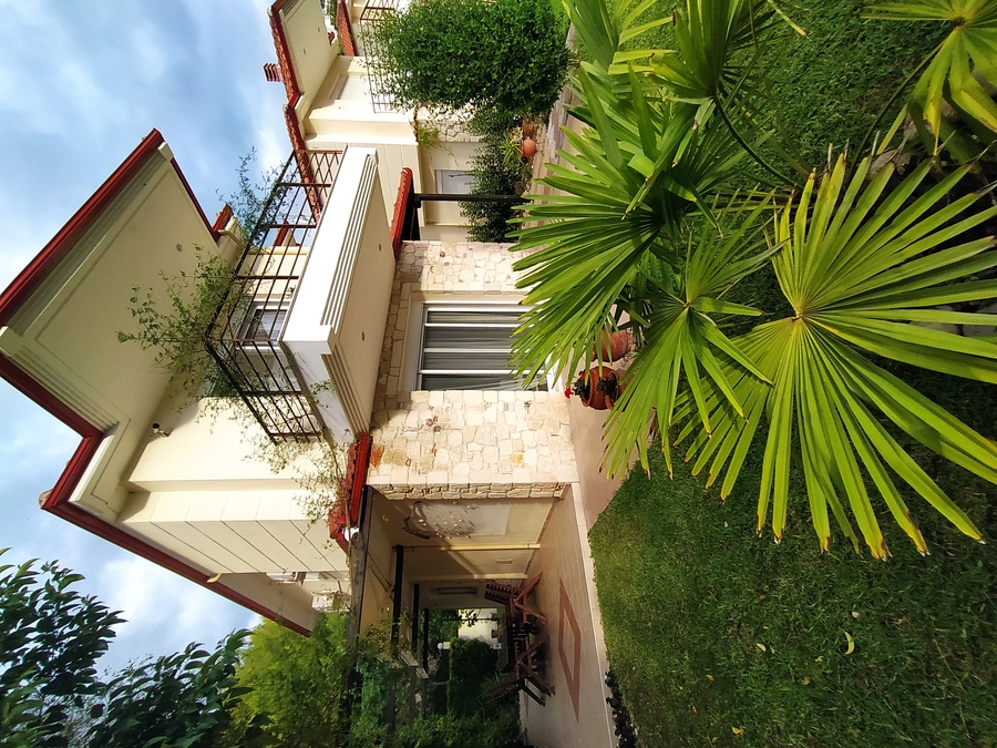 Externally, the house benefits from a private, enclosed garden, offering good privacy. The outdoor areas include a large terrace with a canopy on one side, a BBQ area, and 2 parking spaces.